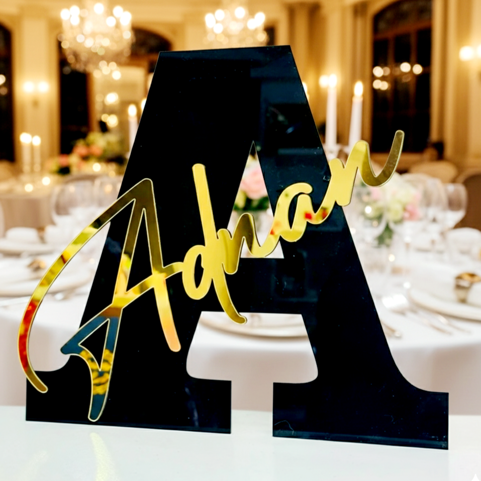 Shop customizable personalized acrylic letter name stands in luxury black & gold finish. Perfect for home décor, weddings, events, offices, and premium gifting. Made to order with high-quality acrylic.